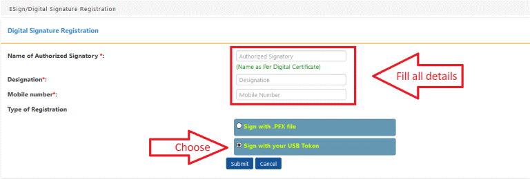 Step – 2 Register your digital signature certificate by filling up the authorized signatory details such as name, designation and mobile no. and in “Type of Registration” choose Sign with your USB Token and Click on Submit.