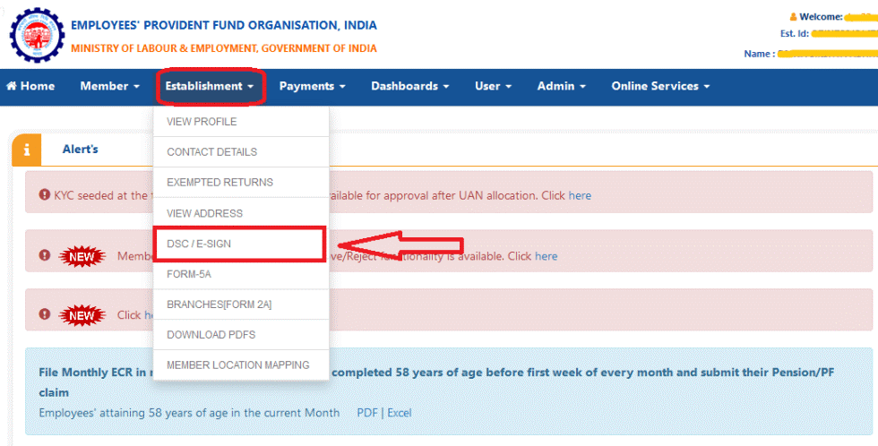 Step – 1Login to Unified Employers Portal then in home page go to Establishment under menu bar tab then click on DSC / E-SIGN.