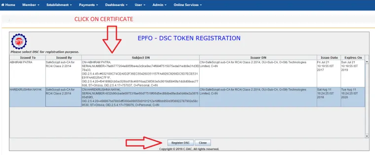 Employer needs to connected the DSC token to Laptop or Desktop and follow the below steps to successfully register your digital signature certificate in EPFO portal :