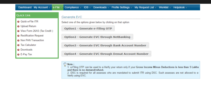 Step 5: When you click on e-verify, there is a list of modes through which you can generate an EVC.