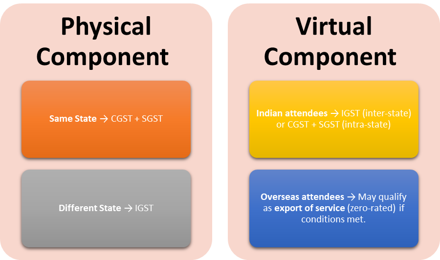 While they offer wider reach and flexibility, they also create unique GST challenges in India. Organisers must navigate different GST rules for in-person and online services, plus determine the correct place of supply, registration type, and input tax credit (ITC) treatment.
