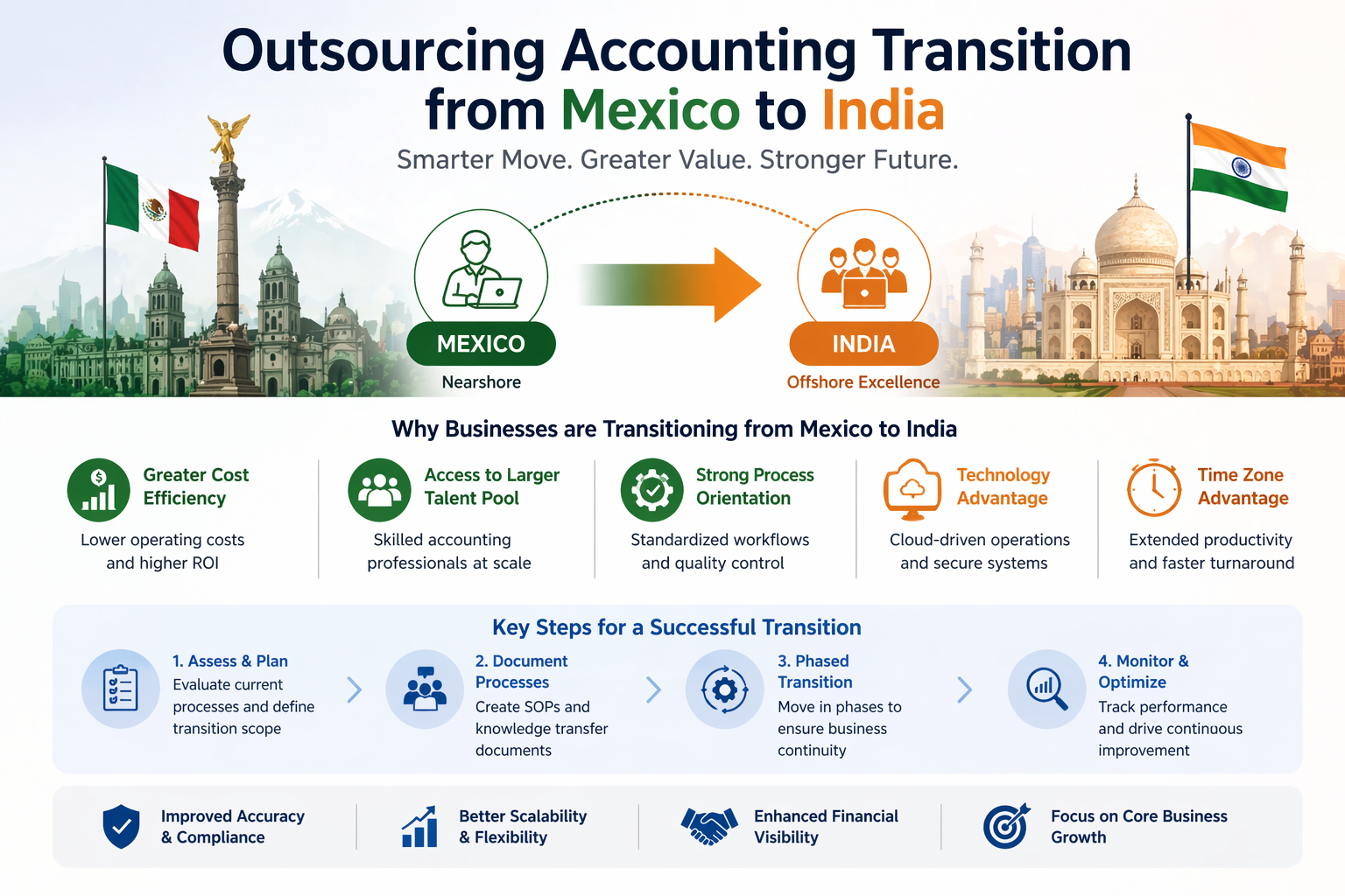Outsourcing accounting transition from Mexico to India is becoming a strategic move for companies seeking efficiency, scalability, and cost optimization. With its strong talent pool, structured processes, and technology-driven approach, India offers a reliable solution for managing global accounting operations.