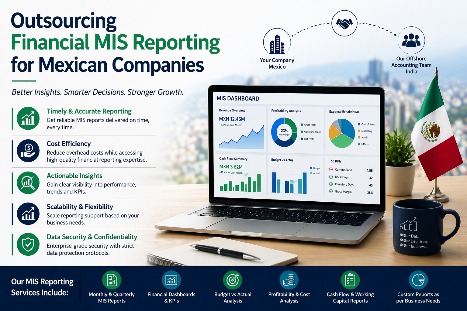 Outsourcing financial MIS reporting for Mexican companies is a powerful strategy for improving financial insights and operational efficiency. By leveraging India-based accounting teams, businesses can access structured, accurate, and timely reports without increasing internal costs.