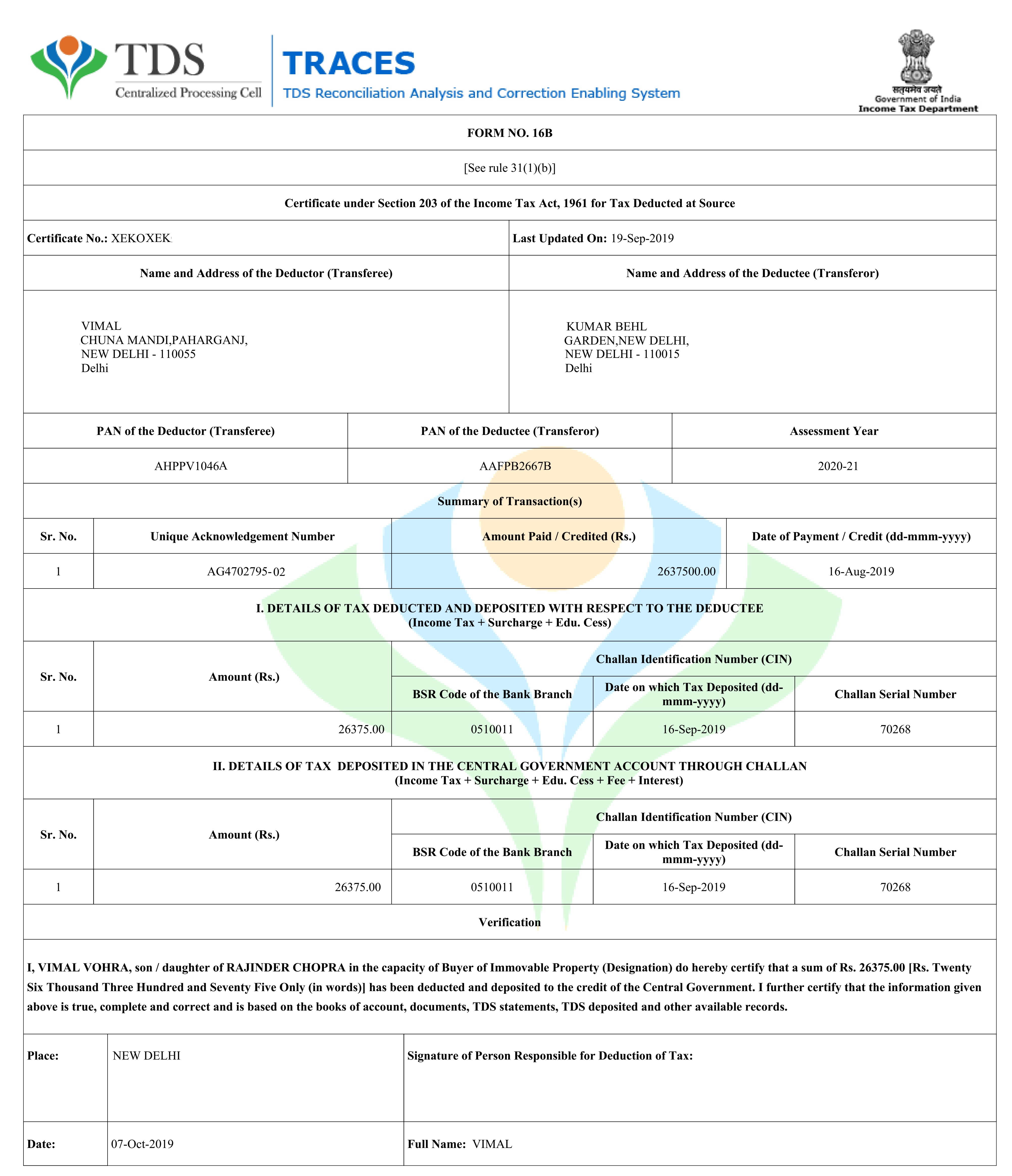 Form 16B certifies that the tax has been deducted at source on the income earned from the sale of immovable property (building or a part of it/ land)